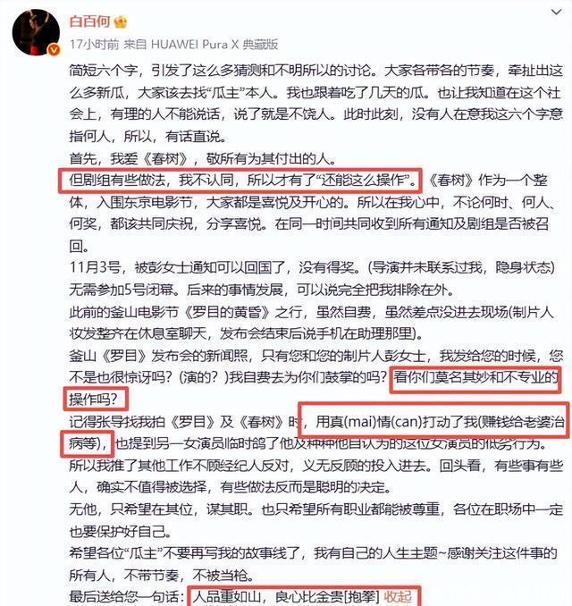 而就在11月6日晚上,白女士发了一个长文,说明这几天到底发生了什么。 自曝实情 她先是指出这几天,因为她的这几个字牵扯出来很多瓜,但确实也和她的事情关系不太大。 所以她就要有事直说了,她表示不认同剧组的一些做法,就在电影入围东京电影节之后,她就前往了日本,毕竟如果得奖了最好是第一时间在现场嘛。
